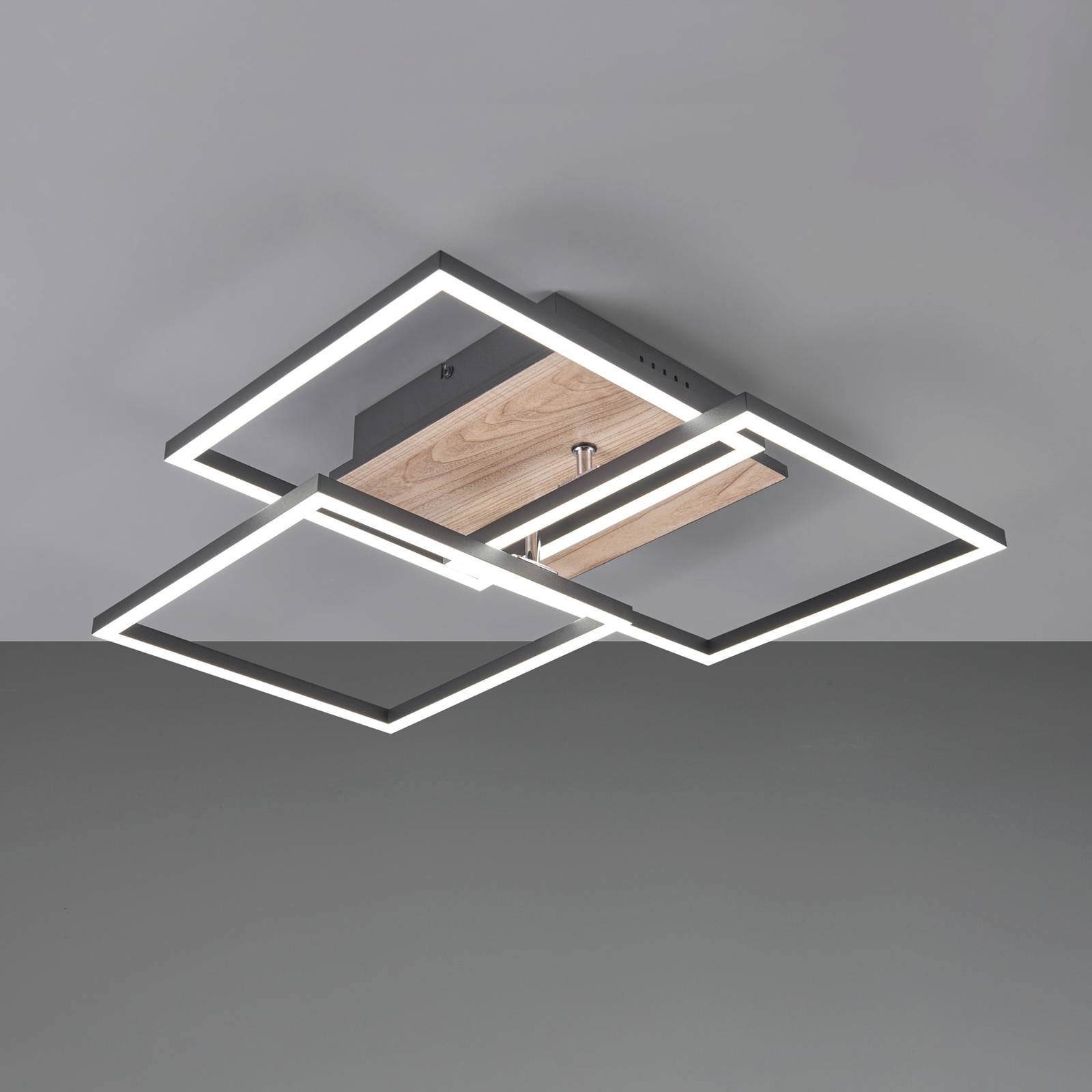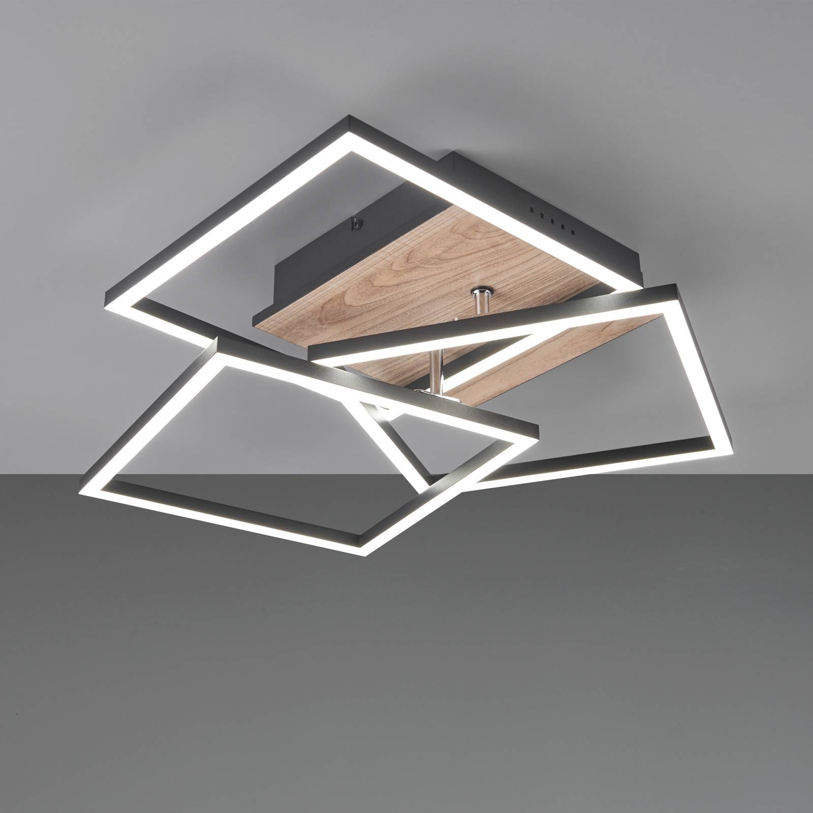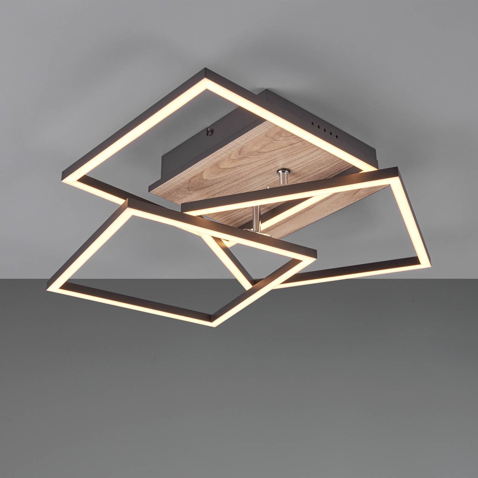Versatile plafoniera LED Mobile in look legno con tre elementi luminosi quadratiLa plafoniera Mobile è particolarmente flessibile in termini di design ed effetto luminoso. È dotata di tre cornici quadrate orientabili orizzontalmente, la cui parte inferiore è dotata di LED. Questi forniscono un'illuminazione diretta che può essere regolata in termini di luminosità e temperatura di colore a seconda del luogo e della situazione. La calotta angolare è dotata di una copertura in pannelli di fibra a media densità, il cui aspetto ligneo conferisce alla plafoniera LED Mobile un aspetto naturale.- La fornitura comprende il telecomando: funzione di regolazione continua della luminosità, cambio di colore CCT (da bianco caldo a luce diurna), luce notturna- Switch-dim: può essere regolata in tre fasi (100 %, 50 %, 25 %) tramite un interruttore a parete convenzionale- Funzione di memoria: l'ultima impostazione selezionata è di nuovo disponibile dopo l'accensione- Può essere utilizzata anche come lampada da parete