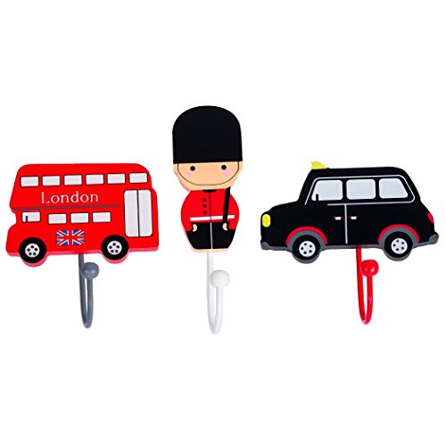 Un set di 3 ganci appendiabiti in legno per bambini a tema Londra Iconica tra cui un bus di Londra, e guardie di Londra, London Taxi.