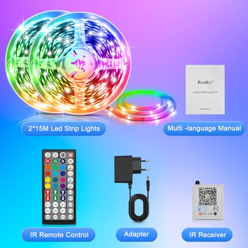 Realky LED Striscia, 30M(2 * 15M) Multicolor Led Strip Light, APP Bluetooth Controllato RGB Strisce LED, Luci Gaming per Decorare Scale, Festa, Cucina Casa, Bar