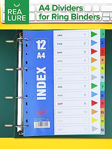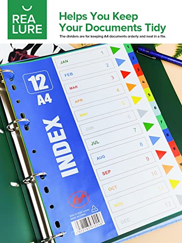 Realure Divisori Colorati per Raccoglitori A4, PP12, Linguette con Numeri 1-12, Multicolore Raccoglitori ad Anelli, Separatore di Colore in PP, Polipropilene Plastica, Divisori Quaderno ad Anelli A4