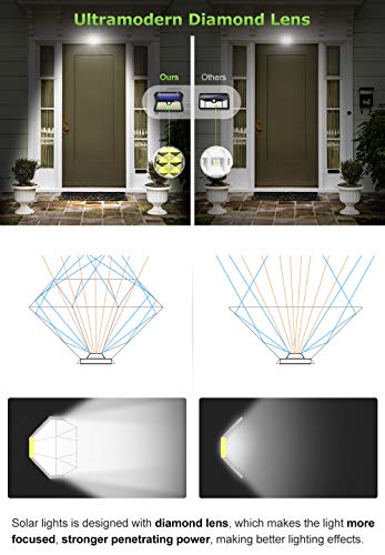 ✔【Migliorare le luci ultra luminose a 283 LED】La lampada solare esterna è dotata di 283 perline LED super luminose. E le luci solari sono dotate di un obiettivo a forma di diamante, simile a un faro per auto, che può focalizzare la luce, rendendo la luce più luminosa e la gamma di illuminazione più ampia.