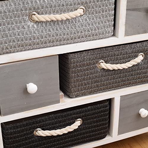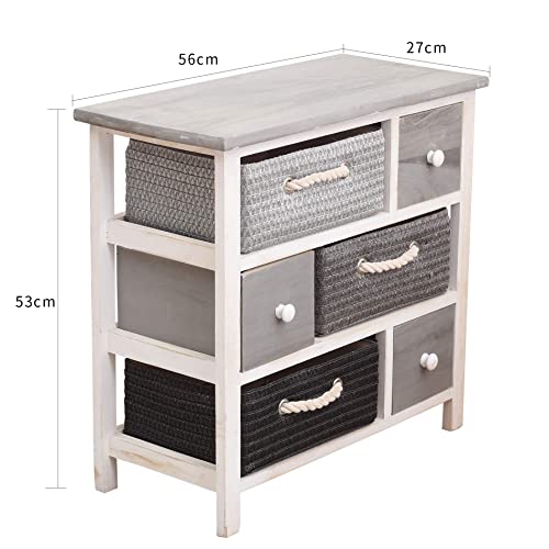 SPECIFICHE: Dimensioni: H 53 cm x L 56 cm x P 27 cm - Dimensioni Cassetti Legno (3): H 13,5 cm x L 15 cm x P 24,5 cm - Dimensioni Cassetti Vimini (3): H 12 cm x L 30 cm x P 24 cm - Colore: Bianco, Grigio, Nero - Materiale: Paulownia, MDF, Vimini - Cod. RE4326