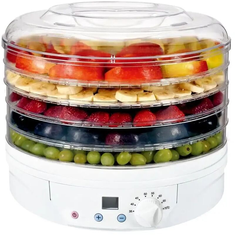ESSICCATORE DIGITALE PER ALIMENTI POTENZA MAX 260W ARTUS DO3 • Potenza max 260 Watt • A 5 vassoi Ø cm. 32x3,3 h • Consente di conservare gli alimenti, senza alterarne il sapore e i valori nutrizionali • Ideale per carne, pesce, funghi, frutta, legumi e verdura • Regolazione digitale del tempo di funzionamento • Temperatura regolabile fino a 70° C • Pareti trasparenti per il controllo immediato e continuo del processo di essiccazione • Sistema di aerazione forzata dal basso • Consumi energetici ridotti • Dimensioni Ø cm. 32x28 h