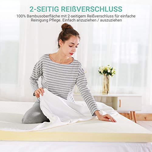 Memory Foam: il nostro topper è realizzato al 100% in puro memory foam. Abbiamo rinunciato a fori, gel, aloe e altri "trucco", perché non hanno alcun effetto in termini di accumulo di calore. Al contrario, influiscono negativamente sulla pressione del Memory Foam. La nostra schiuma si adatta alla forma naturale del tuo corpo, garantisce sufficiente stabilità durante il sollievo dei punti di pressione e offre un'esperienza di sonno rilassante.