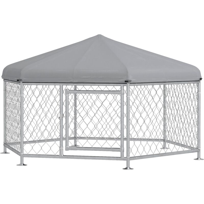 Recinto Recinto per Cani Taglia Grande 2,1x1,85x1,2m Tetto in Tessuto Oxford Anti UV Argento e Grigio Questo recinto per cani è adatto per tenere i tuoi animali al sicuro e al riparo da sole e pioggia, grazie alla copertura in tessuto Oxford. Realizzato in acciaio galvanizzato, il kennel per cani è progettato per resistere all'uso negli spazi esterni e all'esuberanza di cani di taglia media fino a 20 kg. Specifiche Tecniche Tessuto Oxford 360D resistente ai raggi UV e all'acqua, per proteggere il tuo animale da sole e pioggia Recinto per cani facile e veloce da assemblare con connettori a molla Struttura in acciaio galvanizzato e rinforzato Porta con blocco per tenere il tuo animale al sicuro Forma del kennel per cani esagonale Ideale per cani di taglia media con peso inferiore a 20 kg Facile montaggio in mezz'ora, sono necessarie 2 persone Caratteristiche Tecniche Colore: Argento, grigio Materiale: Acciaio zincato, tessuto Oxford Dimensioni complessive: 2.1L x 1.85P x 1.2A m Altezza