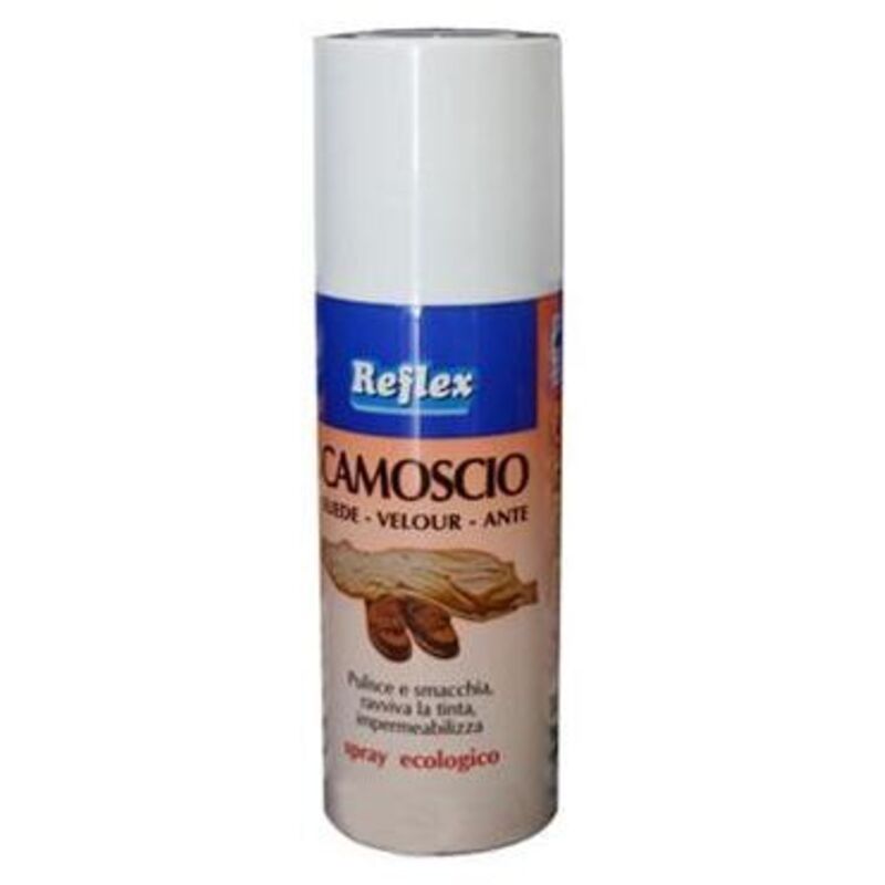 Pulisce, smacchia ravviva la tinta e impermealizza. Bomboletta spray ecologica da 200 ml. Colore neutro. Ideale per calzature, borse e indumenti in pelle scamosciata. Reflex RAVVIVANTE SMACCHIATORE Spray per CAMOSCIO 200 ML Neutro