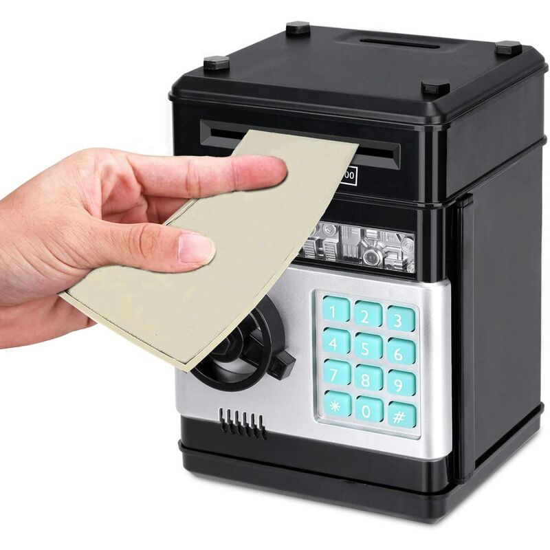Banca automatica della carta in rotolo: Posizionare la carta sul rotolo, può essere arrotolata automaticamente nella macchina. (Ma non funziona se la carta è troppo vecchia o troppo morbida) Password Safe Cash Box: inserisci la password a 4 cifre (predefinita: 0000, le password possono essere modificate a piacimento), la luce verde si accenderà, il divieto di suini può essere aperto. . Se inserisci la password sbagliata, la luce rossa si accende e il suono di PER FAVORE RIPROVA ti chiederà (non puoi aprirla, se la password è sbagliata) Migliora la sicurezza della proprietà del bambino Consapevolezza: la mia cassaforte mantenendo le proprie cose. Può essere utilizzato per riporre giocattoli, gioielli, figurine di baseball, ecc. inserisci le monete nella parte superiore del salvadanaio e inserisci le banconote sul lato, usa la cassaforte come salvadanaio. Alta capacità: Può contenere 600 monete o 100 pezzi di carta. interessante e divertente, un articolo indispensabile per bambini o