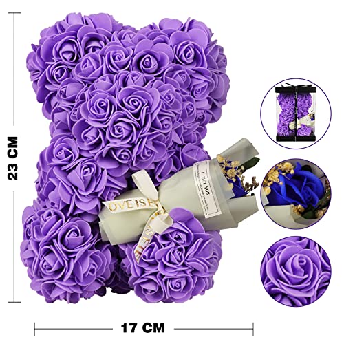 Regali di San Valentino, orso rosa artificiale, orsetto di peluche a con fiori, ideale come regalo per la Festa della Mamma, regalo di compleanno, con scatola regalo trasparente (viola)