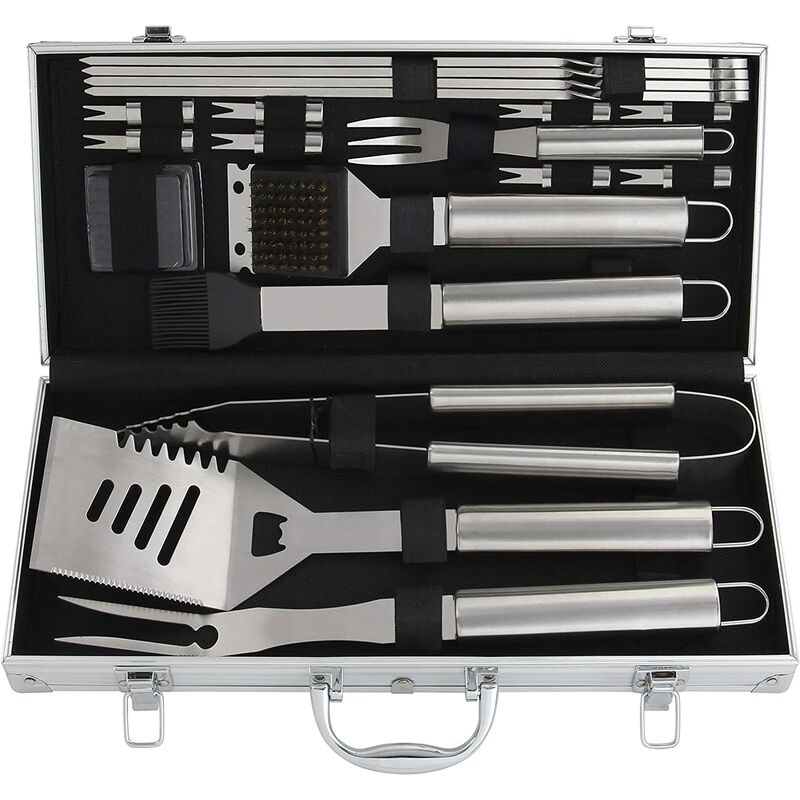 [Set barbecue professionale da uomo] include spatola 4 in 1, pinze, forchetta barbecue, forchetta bistecca, spazzola per olio in silicone, spazzola per la pulizia, testina extra, 4 spiedi, 8 griglie di mais e un contenitore in alluminio. [Utensili per barbecue in acciaio inossidabile di alta qualità] L'eccellente struttura in acciaio inossidabile, resistente, è il kit di cottura perfetto per soddisfare tutte le esigenze del barbecue. È sicuro metterli in lavastoviglie. [Regali perfetti per la festa del papà per uomini e donne] Un regalo ideale per il barbecue per testimoni, buongustai, amanti del barbecue e appassionati di campeggio per la festa del papà, il compleanno e il Natale. [Goditi un barbecue multifunzione] Con questa robusta borsa per accessori per barbecue, goditi il barbecue sulla spiaggia, fai festa in riva al lago, accampati all'aperto e goditi tutte le altre attività di intrattenimento. [Set di strumenti per barbecue dalle prestazioni senza pari] Ci impegniamo a