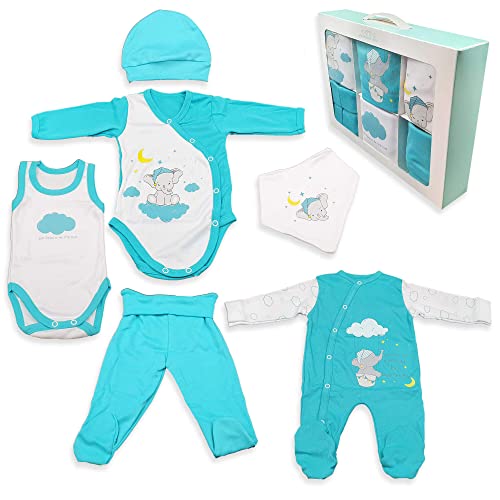 QAR7.3 set Regalo neonato 6 pezzi. Il Completino neonato 6in1 contiene: tutina, body maniche lunghe, body senza maniche, bavaglino/bandana, cappellino, pantaloni del pigiama (56, Turchese)