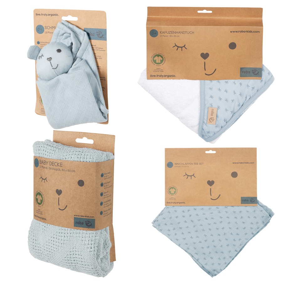 Il set regalo biologico roba 'Lil Planet ' assicura un lavaggio piacevole e una sensazione di coccole e asciutto, dopo il bagno con una spugna di cotone amica della pelle, senza sostanze inquinanti e che assorbe l'acqua. Il set regalo è composto da un asciugamano con cappuccio, tre asciugamani, un panno per le coccole con una simpatica faccia da coniglietto e una coperta a maglia per bambini in tessuto di cotone biologico. I materiali più puri, sostenibili e non trattati sono utilizzati nella produzione dei prodotti biologici per bambini. Anche dopo molti lavaggi, i prodotti Bio-Baby mantengono la loro forma e la sensazione di super morbidezza. Grazie al trattamento speciale della superficie e al prelavaggio, i prodotti rimangono super morbidi. La serie di tessuti organici roba 'Lil Planet ' è disponibile nei colori di tendenza rosa/malva, azzurro/cielo e grigio argento. La serie tessile è prodotta in modo sostenibile secondo il Global Organic Textile Standard GOTS e in condizioni eque e sociali della Business Social Compliance Initiative (BSCI). La serie è certificata secondo i più severi criteri ecologici con OEKO TEX® Standard 100. Dettagli del prodotto: Asciugamano con cappuccio Interno 100 % cotone spugna GOTS Cappuccio in mussola 100% cotone organico GOTS Dimensioni 80x80 cm Asciugamani 2x azzurro/cielo con motivo, 2x uni azzurro/cielo e 1x uni grigio argento 100% cotone organico Dimensioni: 25x25 cm Panno per le coccole Lato anteriore: 100 % cotone organico Retro: 80 % cotone GOTS, 20 % poliestere Dimensioni: 40x40 cm Coperta in maglia 100% cotone organico Dimensioni: 80x80 cm Tutti gli articoli sono lavabili ad un ciclo ecologico a 40°C