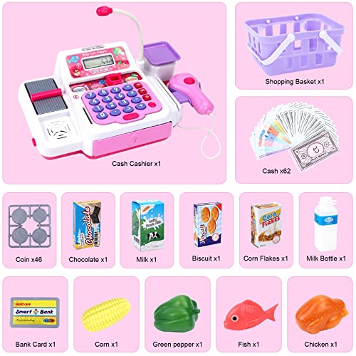 DeAO Registratore di Cassa Giocattolo con Scanner, Microfono, Nastro e Lettore di Carta Set di Accessori per Negozi e Supermercati per Bambini Include Alimenti Giocattolo (Rosa)