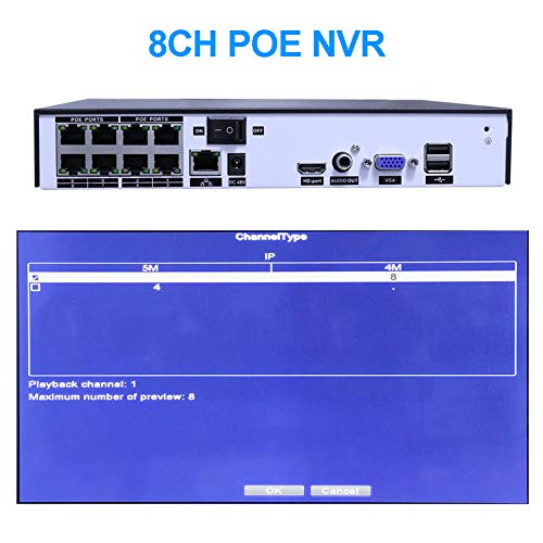 ?Sistema videocamera POE 4K? Videoregistratore POE H.265 5MP 8CH POE NVR (1080p / 3MP / 4MP / 5MP / 4K), supporto risoluzione 4K massima con uscita VGA e HDMI.