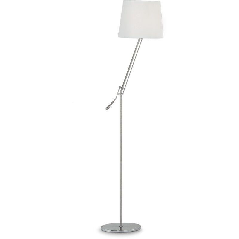 Montatura snodata in metallo. Diffusore regolabile ad altezze diverse. Disponibile con finitura nickel satinato e paralume rivestito in tessuto bianco Ø 32 x H 163 cm E27 max 1 x 60W IP20