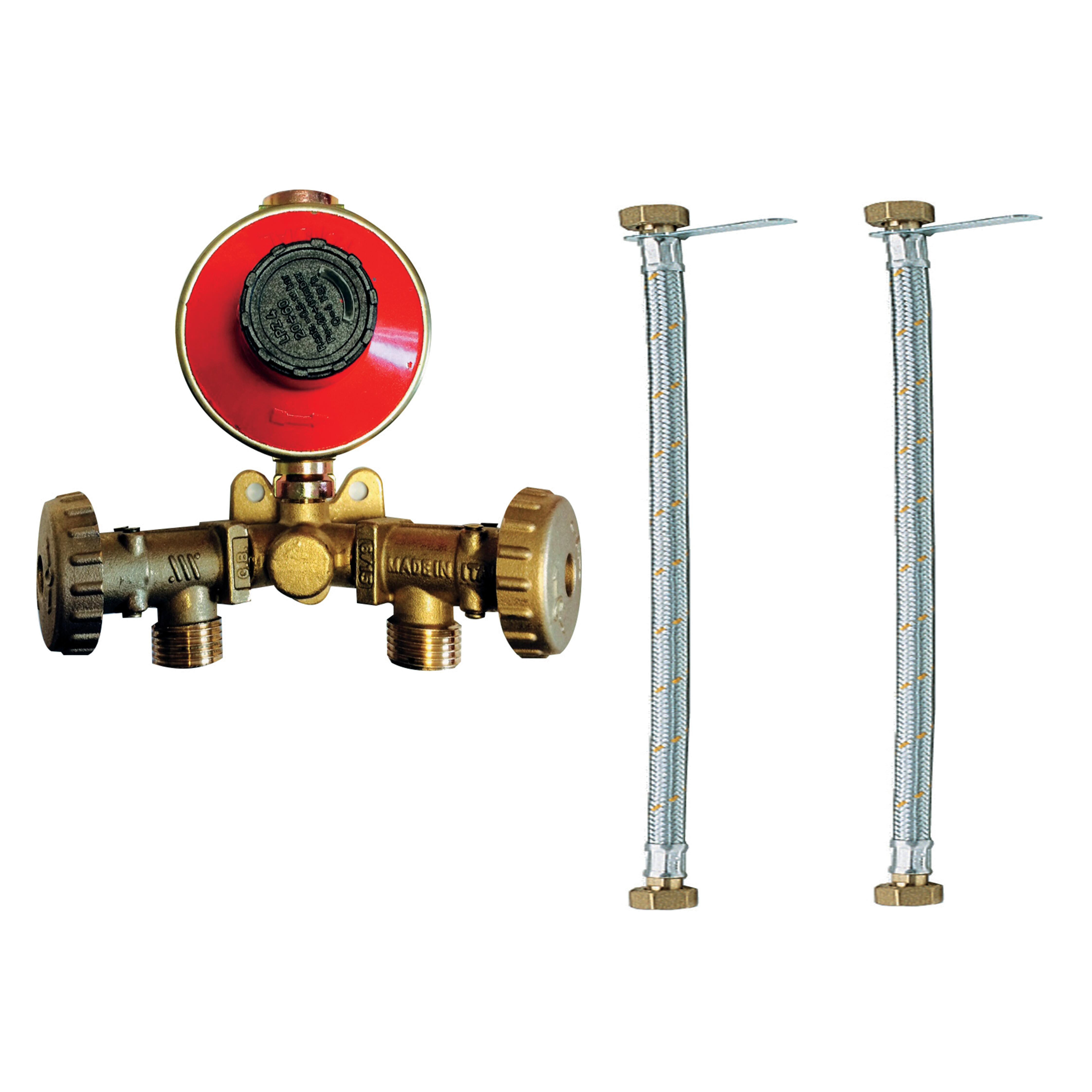 Centralina 2 attacchi con flessibili di 50 cm e regolatore bassa pressione con portagomma, 0,02 bar