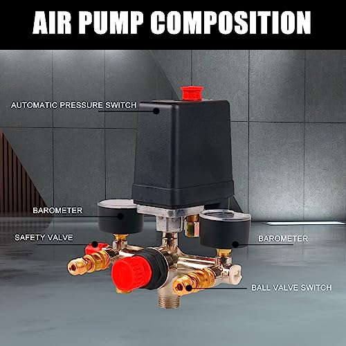 Buona qualità: il regolatore di pressione compressore realizzato in lega di alluminio di alta qualità + ferro, compressore ad aria compressa dal design preciso, robusto e durevole, con un regolatore del compressore pressostato con due manometri per un uso a lungo termine.