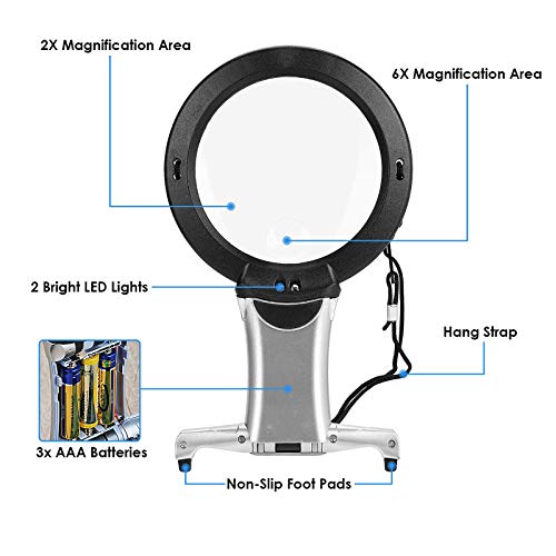 Rehomy - Lente di lettura con lente di ingrandimento 6x, grande con luce a 2 LED, lente di ingrandimento gigante, lettura vivavoce