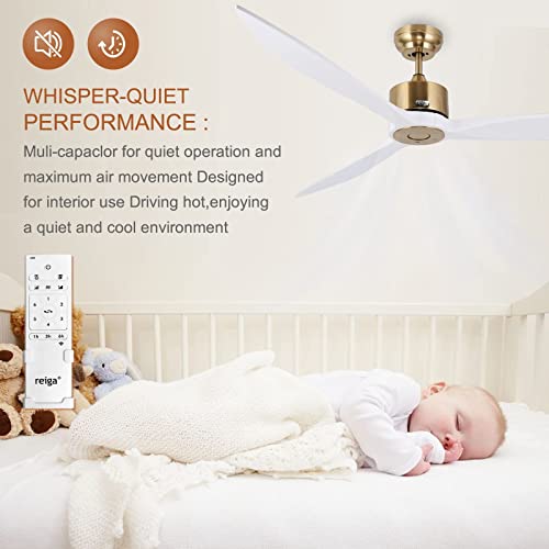 Reiga Ventilatore da soffitto legno con telecomando, 165CM con motore DC, ultra-silenzioso 6 velocità, timer fino 8 ore, con app smart - colore oro bianco