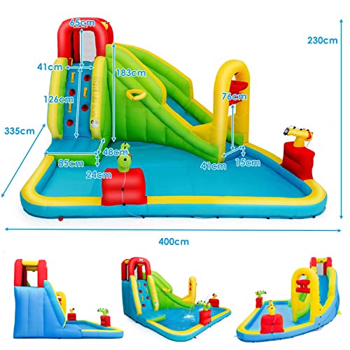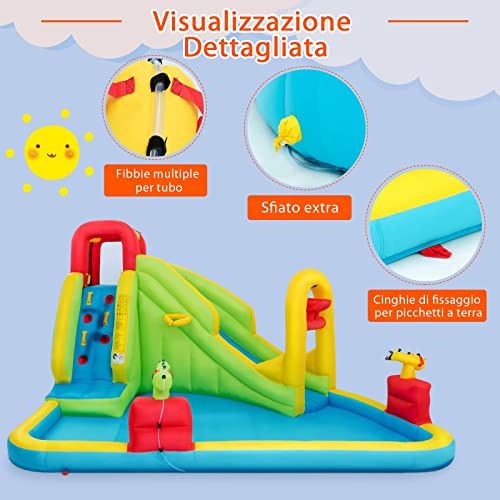 ★Divertimento Infinito con Multi Giochi★ Questo gonfiabile integra una varietà di giochi tra cui uno scivolo largo, una salita da arrampicata, una piscina con due cannoni d'acqua, un anello e una palla di canestro e un set di tubo e ugelli per spruzzare l'acqua. I bambini possono divertirsi per ore sia con l'acqua che senza.