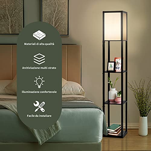 ★Luce 2 in 1 in Legno con Scaffalature★ La lampada da terra in legno combina la luce e lo scaffale, illumina la stanza e offre anche una zona per conservare libri, giornali e riviste. La lampada con i tre scomparti è un'area ideale per esporre i vasi e le foto. La luce che passa attraverso il paralume in tessuto è tenue e non abbaglia.