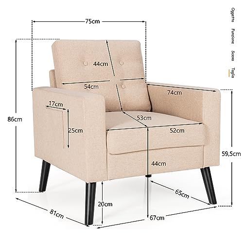 RELAX4LIFE Poltrona Singola con Braccioli, Poltrona Relax con Cuscini per Schienale e Seduta e Gambe in Legno di Gomma, con Rivestimento in Lino per Soggiorno, 67×81×86cm (Beige)