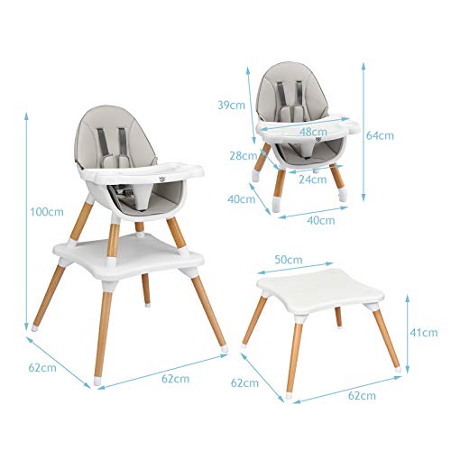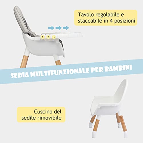 RELAX4LIFE Seggiolone Pappa Evoluzione 4 in 1, Seggiolone in Legno con Vassoio e Sedile con Cinghia, Altezza Regolabile, Seggiolone con Cintura di Sicurezza a 5 Punti, 6 Mesi - 3 Anni (Grigio)