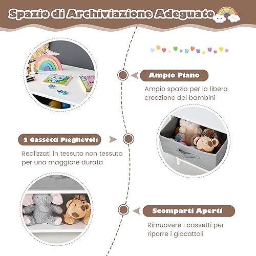 ★Tavolo con spazio di archiviazione★ Questo tavolo per bambini è dotato di 2 vani portaoggetti aperti sul fondo e 2 cassetti in tessuto non tessuto. 2 cassetti possono essere facilmente rimossi per uso individuale. Il design del vano portaoggetti consente ai bambini di organizzare meglio le loro cose.