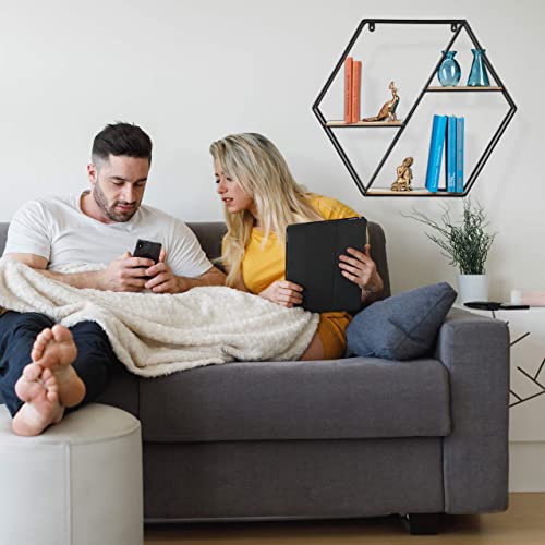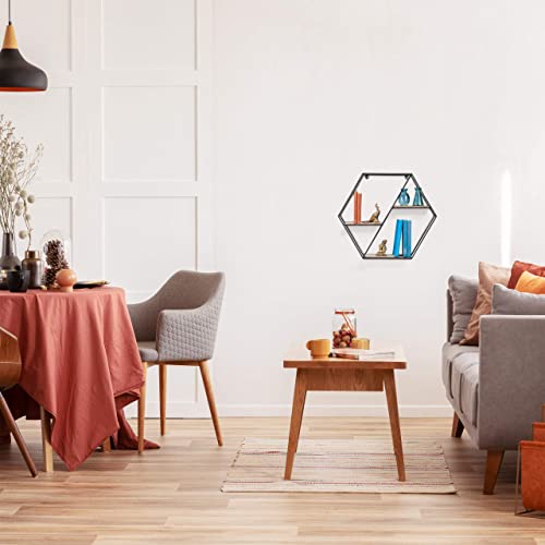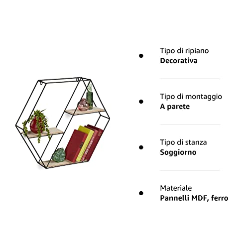 Relaxdays 10028936 Mensole da Muro Design Esagonale, 3 Ripiani, Legno & Metallo, da Parete, HLP: 51x59x11 cm, Naturale/Nero, Pannelli MDF, Ferro, 1 pz