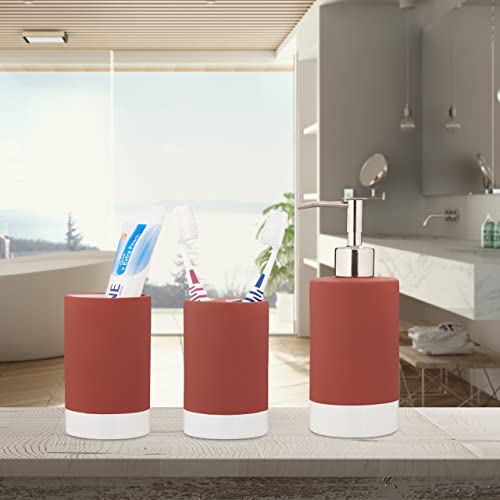 Relaxdays 3 Accessori Set Bagno, Dispenser Sapone, Portaspazzolini, Bicchiere Dentifricio, Ceramica e Acciaio, Rosso, 90% 10% Inox