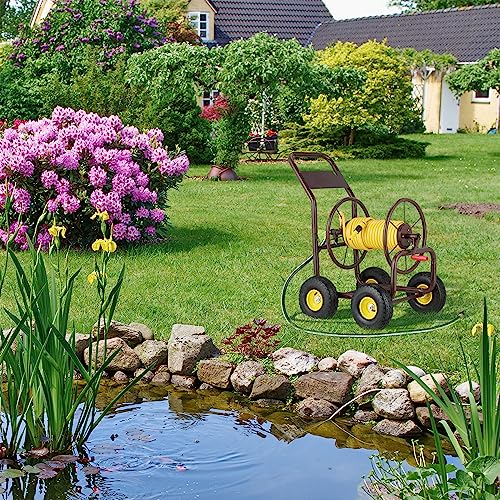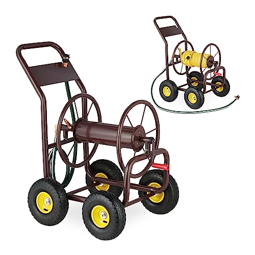 Relaxdays Carrello Avvolgitubo Giardino, Raccordi 3/4", Carrellino per Tubi dell'Acqua 80m, 4 Pneumatici, Ferro, Marrone, Gomma plastica