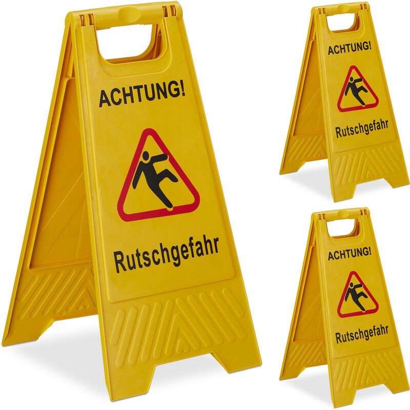 Questo set da 3 cartelli aiuta a prevenire incidenti avvisando con una scritta e un'illustrazione del pericolo di scivolamento. Che sia per uffici, centri commerciali o negozi, è sufficiente appoggiare i cavalletti nei pressi di pavimenti bagnati, scivolosi o appena lavati per avvertire tutti i passanti del pericolo. La scritta è in tedesco, ideale per strutture turistiche nel Sud Tirolo o Svizzera. Quando poi non serve più si può ripiegare e sistemare nello sgabuzzino in modo salvaspazio. Cartello per pavimento bagnato in dettaglio - Misure H x L x P: 59 x 29 x 30 cm ca. - Segnale piegato H x L x P: 60 x 29 x 3 cm ca. - Scritta Achtung! Rutschgefahr (italiano: Attenzione! Rischio di scivolamento) - Peso: 0,6 kg ca. - Materiale: plastica PP - Colore: giallo, rosso, nero Set da 3 segnali di sicurezza di avviso pavimento bagnato - Posizionare su pavimenti appena lavati e scivolosi - Su entrambi i lati si legge l'avvertimento in tedesco - Per prevenire incidenti su pavimenti bagnati