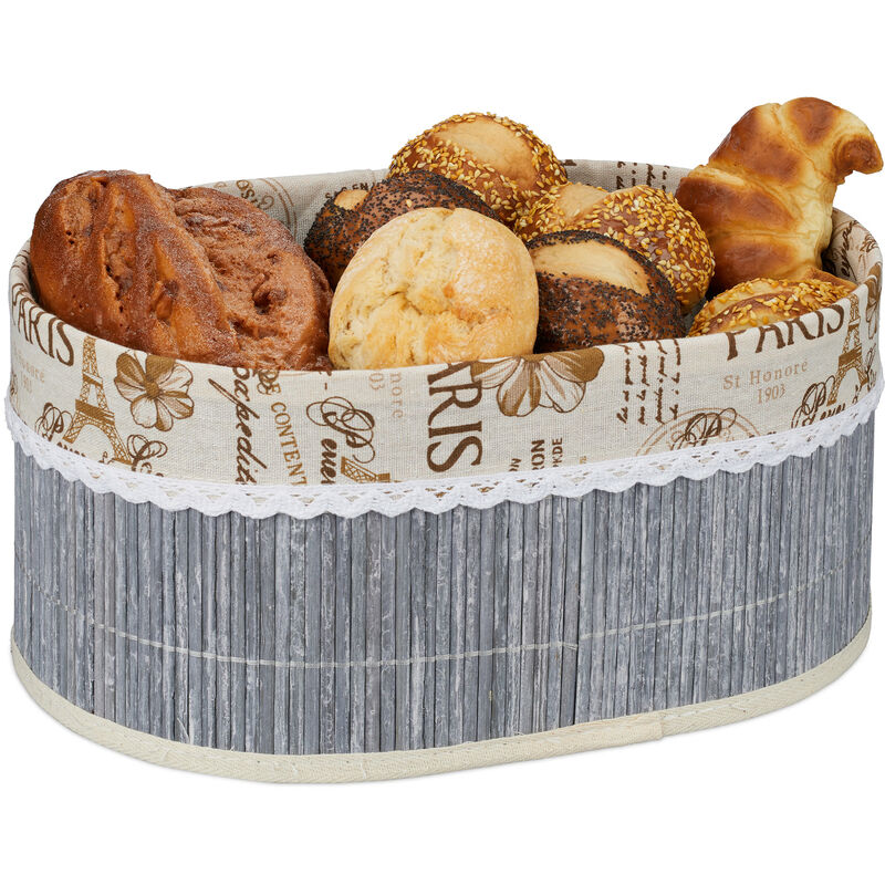 Basta servire il pane a tavola semplicemente sulla tovaglia come dei barbari: servi finalmente il pane, panini, ciabatte, cornetti e altri prodotti da forno con questo elegante cestino porta pane. La struttura in bambù grigio si combina armoniosamente con il sacchetto di stoffa interno con le stampe a tema parigino. Durante il pranzo o il buffet, le briciole restano nel sacco interno e per pulirlo basta scrollarlo. Usa il cestino non solo per il pane, ma anche come porta frutta o verdure in cucina. Cestino per pane in dettaglio - Misure complessive H x L x P: 16 x 34 x 24 cm ca. - Misure interne H x L x P: 15 x 33 x 23 cm ca. - Peso: 320 g ca. - Materiale: poliestere, acciaio, bambù - Colore: grigio, beige Contenitore pane con interno in stoffa - Per servire pane, panini, cornetti e molto altro - Perfetto per buffet, colazione e spuntini - Gusta lo charme parigino mentre fai colazione - Cestino grande e in bambù grigio - Sacchetto interno con stampe a tema - Sacco interno rimovibile