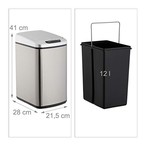 Relaxdays Cestino dei Rifiuti con Sensore, Automatico 12 L, Cesto Rettangolare con Coperchio & Secchio Interno, argento