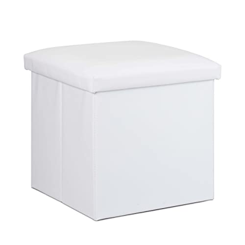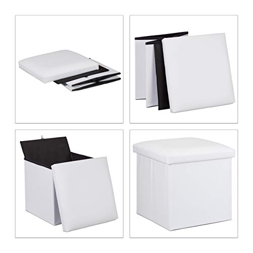 Relaxdays Pouf con Contenitore, finta pelle, Imbottitura Gommapiuma, Coperchio, Pieghevole, HxLxP: 38x38x38 cm, Bianco, pannelli MDF, 1 pz