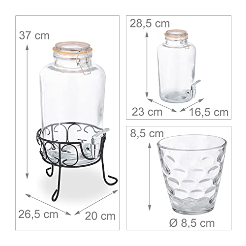 Relaxdays Dispenser per Bevande in Set, Distributore Acqua 4 L, 4 Bicchieri Retro Erogatore con Rubinetto, Trasparente