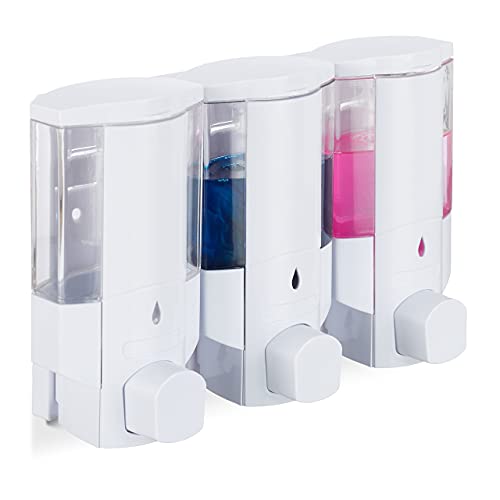 Relaxdays Dispenser di sapone a 3 scomparti, montaggio a parete, 300 ml, igienico, ricaricabile, per bagno e cucina, colore: bianco/trasparente