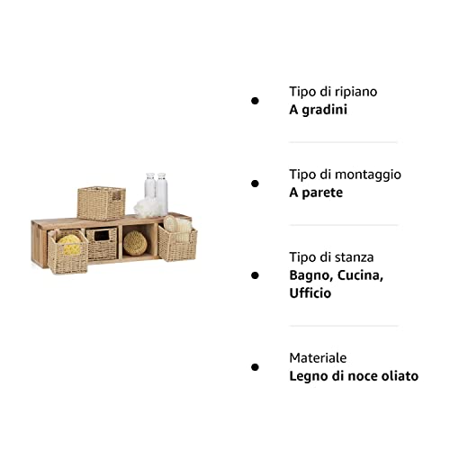 Relaxdays Mobile a Parete in Legno di Noce, con 4 Ceste Portaoggetti Estraibili, Scaffale, Mensola a Muro, Naturale