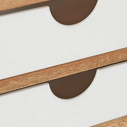Design: cassetti e specchio bianchi in elegante contrasto con le tonalità calde e naturali del legno