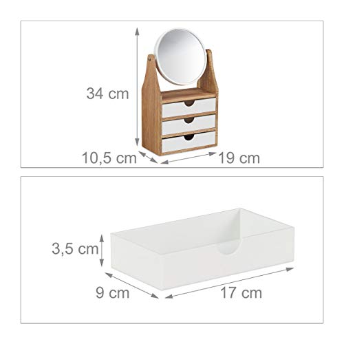 Relaxdays Organizer per Trucchi, 3 Tiretti, per Tavolo da Trucco, Specchio Ingranditore, 34x19x10,5 cm, Naturale/Bianco