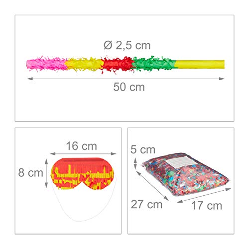 Relaxdays Pinata Set torta di compleanno, 4 pezzi, XXL, coriandoli con maschera per gli occhi, spinata di compleanno, bastone e maschera, multicolore