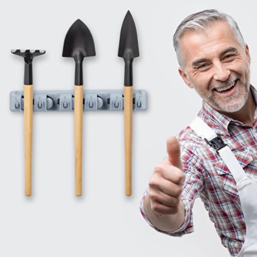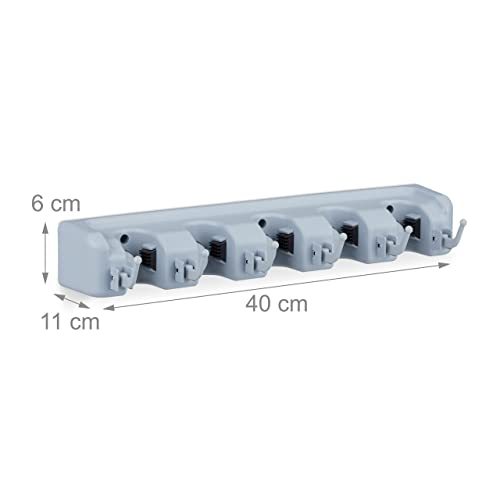Relaxdays Porta Scopa & Attrezzi, 5 Posti e 6 Ganci, Appendini da Esterno & Interno Universali, a Muro,40 cm, PP, grigio