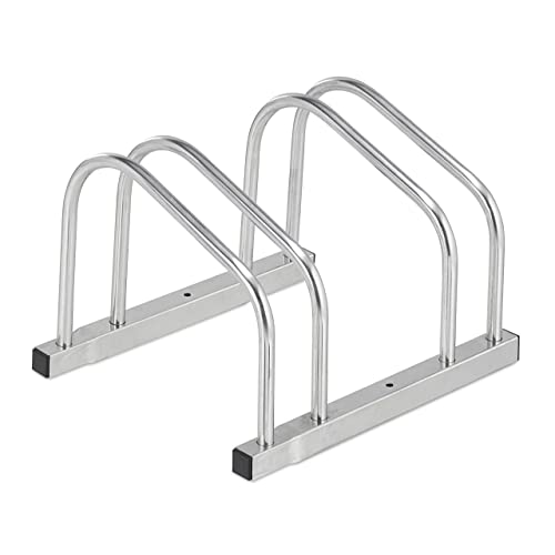 Relaxdays Portabici da Terra, Supporto per 2 Biciclette, E-Bike, Parcheggio Ruote Fino 50 mm, 26x38,5x33,5 cm, Argentato
