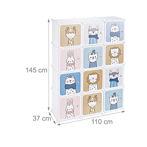 Relaxdays Scaffale Componibile da Cameretta, 2 Aste Appendiabiti, Disegni Animali, HLP: 145x110x37 cm, Incastro, Bianco, 1 pz