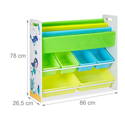 Relaxdays Scaffale Porta Giochi, con 6 Box e 4 Scomparti di Stoffa, Immagini Sirena, HLP: 78 x 86 x 26,5 cm, Colorato, Truciolato, Metallo, PP, 1 pz