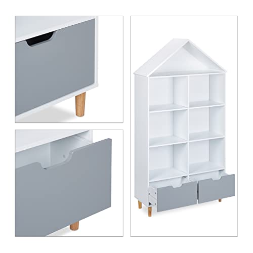 Relaxdays Scaffale Portagiochi, a Forma di Casa, 7 Scomparti, per Libri e Giocattoli, HxLxP: 161x87x30 cm, Bianco Grigio
