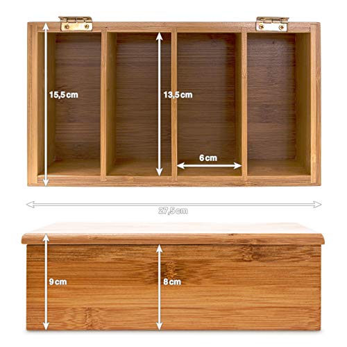 Contenitore: scatola porta tè e tisane con 4 scomparti, ognuno con spazio per 20 bustine circa