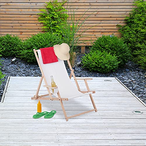 Relaxdays Sedia Sdraio Pieghevole, in Legno e Tessuto, 3 Posizioni, con i Braccioli e Porta Bevande, 120 kg, Bianco, Faggio, 1 pz