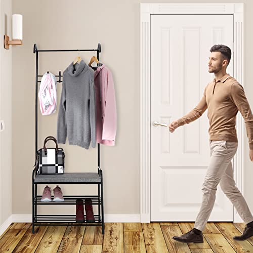Relaxdays Stand Appendiabiti con 2 Ripiani Porta Scarpe e Panca, Asta e 4 Appendini, HLP: 173x64x30 cm, Guardaroba, Nero, 80% Acciaio gommapiuma 10% Poliestere