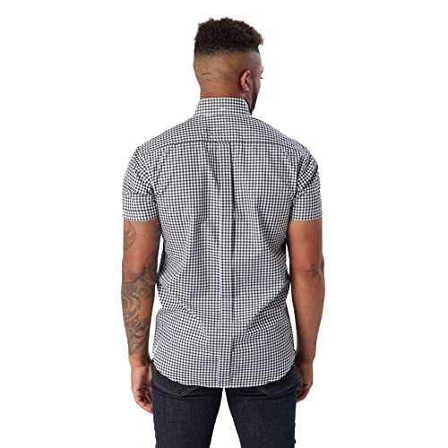 Davanti: camicia a maniche corte a quadretti neri con abbottonatura classica. Abbottonatura sul davanti. Tasca sul petto. Maniche con taglio e bottone ornamentale. Orlo arrotondato