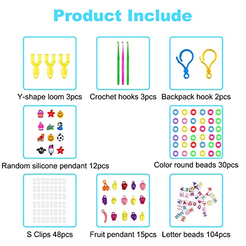 【Set di elastici】 Il set di elastici arcobaleno contiene circa 2500 elastici colorati, 3 telai a Y, 3 aghi per uncinetto, 2 ganci, 12 ciondoli in silicone casuali, 30 perline a botte, 48 fibbie, 15 pezzi Ciondolo frutta, 104 perline con lettere, ricchi accessori per soddisfare le vostre esigenze